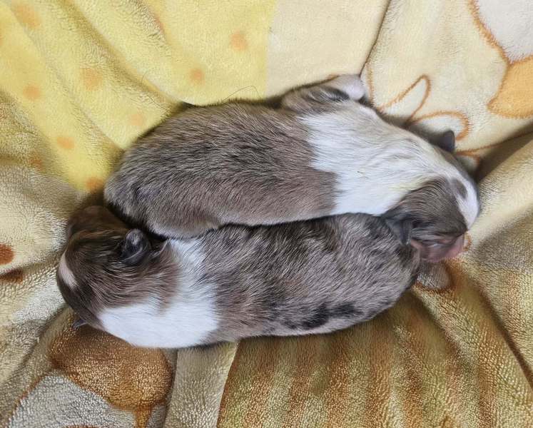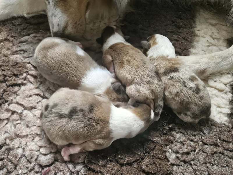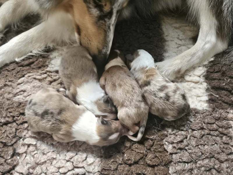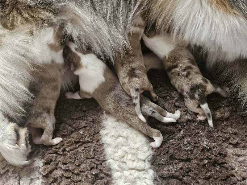 Am 11.10.2025 hat Lacey - Glamorous blue Sparkle of Kingly Shine nach Knight N Gold of Kingly Shine 4 gesunder Welpen problemlos zur Welt gebracht. 2 Rüden und 2 Hündinnen, alle in sable merle.